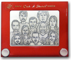 The Etch Man will sketch up to 30 guests on a traditional Full-Size Etch A Sketch (1-4 units per party) or approximately 10 guests on a 5.5 x 6 inch Travel Size Etch A Sketch (2-6 units per party). Guests take home a digital print of their group sketch while the host gets to keep the preserved Full-Size Etch A Sketches.