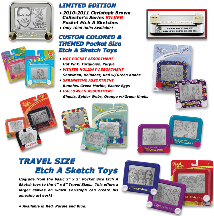 Upgrade from basic Pocket Size RED Etch A Sketches to an exciting PREMIUM option! Choose "Christoph Brown Collector's Series 2010-2011" Limited Edition SILVER Etch A Sketches, assorted seasonal and holiday designs, hot custom colors, or even the larger Travel Size!